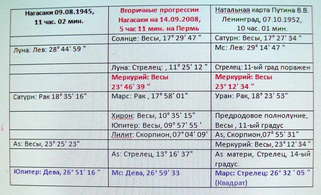 Дополнительно следует отметить положение натальной Луны трагедии в Нагасаки в 28 °44‘ 59 °Льва , то есть в соединении с As пилота в 29° 58‘ 56 » Льва и с Мс Путина В.В. в 29° 14‘ 47 » Льва .