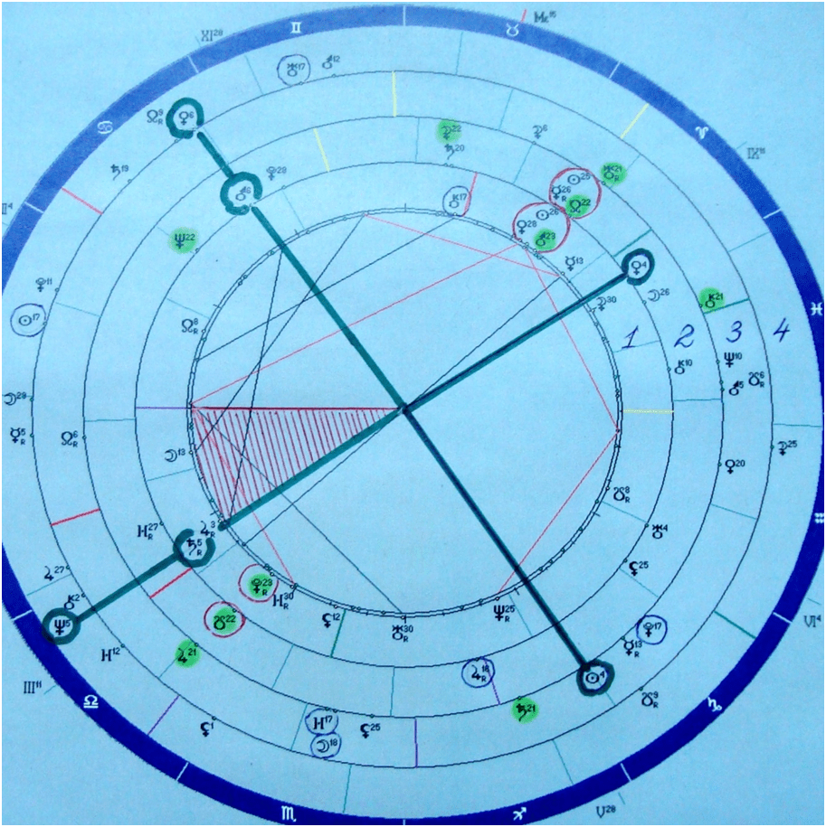 Натальная карта (отмечено на двух схемах 1) летчика Волкова Романа Александровича , 15.04.1981 года рождения, Ленинградская область, город Пушкин. Час и минута рождения устанавливались следующим образом. Предродовое новолуние 05 апреля 1981 года 0 час 19 мин 27 сек. При этом, 4 планеты находятся в 15 градусе Овна, а именно Солнце, Луна , Венера, Марс. На роль управителя новолуния претендуют 4 планеты: Марс, Солнце, Юпитер, Меркурий. Самое предпочтительное положение у Солнца и Марса, обе планеты в 15 градусе Овна. Следовательно, в 15 градусе какого- то знака должен располагаться асцендент или вершина 10 дома. Тестируем 15- ые градусы зодиака, наблюдая за получаемыми, при этом, знаками из окружающего мира. Время рождения устанавливаем на 15 часов, 11 мин, 08 сек. Разница с Гринвичем в тот момент +4. При этом, отмечаем наибольшую заполненность 9 дома, там 4 планеты ( дом отвечает за дальние поездки, в том числе и связи с заграницей). По роду деятельности данного летчика такое положение приемлемо, он занимался своим делом. При положении вершины 10 дома в 15- ом градусе Тельца асцендент становится на отметку 30-ый градус Льва. На момент смерти, в 35,66 лет, в условной прямой символической дирекции асцендент попадает в 6-ый градус Весов, соединяясь с натальным Сатурном (фигура на схеме 1 заштрихована красным).