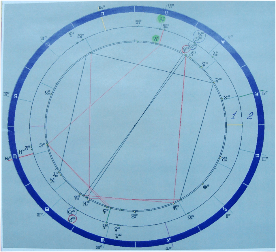 Отдельно стоит обратить внимание на энергию исторической личности, к которой подключен пилот, и которая доминирует в его судьбе. Схема 2. Цифра 1- натальная карта пилота. Цифра 2- предродовое полнолуние генерал- лейтенанта инженерных войск, доктора военных наук, Героя Советского Союза (посмертно) Дмитрия Михайловича Карбышева, родившегося в г. Омске 26.10.1880 г. по новому стилю. Предродовое полнолуние Карбышева Д.М. состоялось 18.10.1880 г. в 09 час, 26 мин, 44 сек. в г. Омске. При этом, положение Луны и Сатурна соответственно 25° 11‘ 00 « и 25° 31‘ 09« Овна. У Волкова Р.А. Солнце находится 25° 23‘ 40« Овнв, то есть, в аспекте соединения к Луне и Сатурну предродового полнолуния Карбышева Д. М. Солнце предродового полнолуния Карбышева Д.М.- Солнце Волкова Р.А., соответственно 25° 11‘ 00 » Весов- 25° 23‘ 40« Овна, васпекте оппозиция. Марс Карбышева Д.М 27° 37‘ 05 » Весов- Венера Волкова Р.А., 27° 28‘ 36« Овна также в аспекте оппозиция.