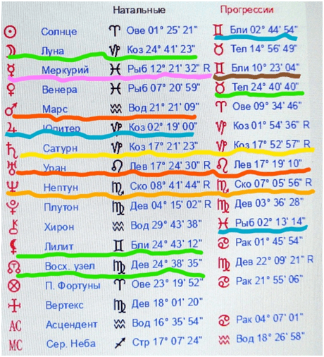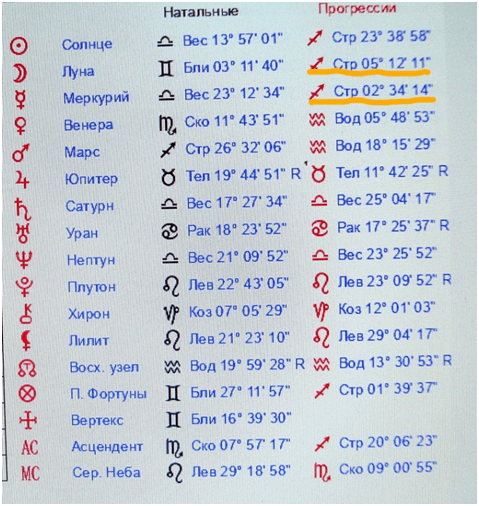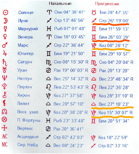 Ниже- карта Путина и вторичные прогрессии. Следом, ниже- карта матери осужденного и вторичные прогрессии. Следует обратить внимание на подчеркнутое зеленым цветом. В карте землетрясения в 24-ых градусах Стрельца- Близнецов находится ось As-Ds. У Путина В.В. Солнце во вторичной прогрессии находится в 25-ом градусе Стрельца. В то же время у матери осужденного активно задействованы 25- градусы в зодиаке, как в натальной карте, так и в прогрессии. Эти позиции планет аспектируют Солнце Путина В.В. во вторичной прогрессии, так и аспектируют карту Екатерины II, её натальную Венеру в 24- ом градусе Близнецов и натальную Луну в 26-ом градусе Близнецов. Если натальный Нептун у матери осужденного в 9-ом градусе Скорпиона, то во вторичной прогрессии он в 8-ом градусе Скорпиона в соединении с асцендентом Путина В.В. Ее Солнце и Хирон во вторичных прогрессиях, а также натальный Юпитер аспектируют натальную Луну Путина В.В. и Меркурий во вторичной прогрессии. Натальный Сатурн в её карте (подчеркнуто желтым), находясь в соединении с Солнцем зачатия Путина В.В. , образует аспект квадрат с его натальным Сатурном, расположенном в 18-ом градусе Весов.