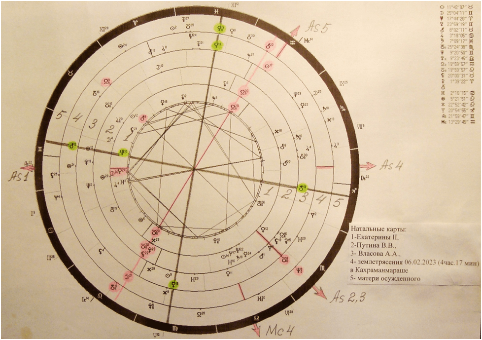 В правом верхнем углу расположение планет на натальной карте Екатерины II, которые отражает внутренняя окружность 1. Ядром ситуации землетрясения является соединение транзитных Лунных узлов, в 8-ых градусах Скорпиона- Тельца с осью As-Ds Путина В.В., а равно Власова А.А., также находящимися в 8-ых градусах Скорпиона- Тельца, что отмечено справа снизу As 2,3, здесь же в карте матери осужденного отмечено положение Нептуна в 9-ом градусе Скорпиона. Вторая важная особенность заключается в соединении Солнца и Луны при данном событии с осями Лунных узлов натальных карт Путина В.В. и Екатерины II. Лунные узлы в натальных картах Путина В.В. находятся в 20-ых градусах Водолея- Льва. А Солнце и Луна при землетрясении, соответственно, в 17-ом и 21-ом градусах Водолея- Льва. В карте матери осужденного с осью Лунных узлов Путина В.В. и Екатерины II соединены Марс в 22-ом градусе Водолея и Уран в 18-ом градусе Льва. Следует отметить, что у Путина на оси его Лунных узлов вибрирует и дополнительная энергия, Лилит в 22-ом градусе Льва, Плутон в 23-ем градусе Льва. As-Ds землетрясения в 24-ых градусах Стрельца- Близнецов в соединении с Венерой и Луной Екатерины II, соответственно в 24-ом и 26-ом градусах Близнецов, а равно, в соединении с её Ds-As в 22-х градусах Стрельца и Близнецов. As карты матери осужденного в 17-ом градусе Водолея в соединении с Солнцем землетрясения в 17-ом градусе Водолея. Межпланетную конфигурацию Большой крест образуют Меркурий матери осужденного и Венера землетрясения в 13-ом градусе Рыб, Меркурий в карте Власова в 13-ом градусе Девы, а также, находящиеся в соединении с осью катастроф Альдебаран- Антарес , Уран Власова в 13-ом градусе Стрельца, Нептун Екатерины II в 10-ом градусе Близнецов и Марс землетрясения в 12-ом градусе Близнецов, Мс (высшая цель) землетрясения находится в 14-ом градусе Весов в соединении с Солнцем Путина В.В. в 14-ом градусе Весов.