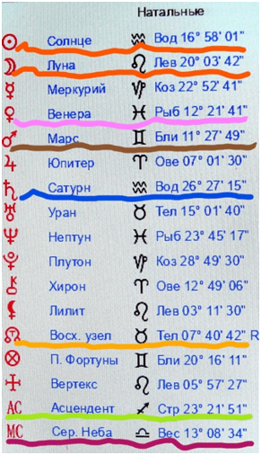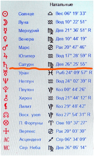 Для наглядности ниже подчеркнуты планеты, образующие септиль, а в некоторых случаях, являющиеся частью септиля от натального Сатурна Путина В.В.