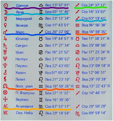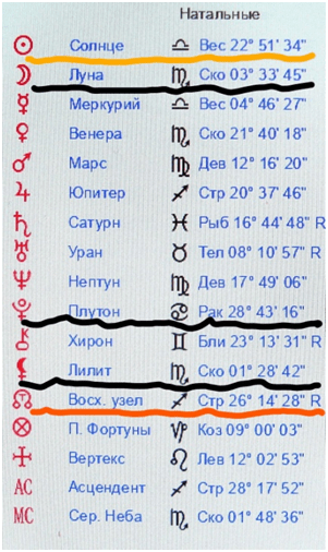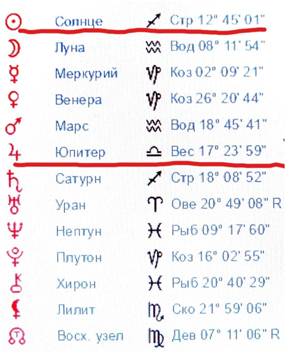 Красным подчеркнуто то, что объединяет эти три карты, а именно: оппозиция натальной Луны и натального Плутона в карте Путина В.С., образующая ось 26-х градусов Стрельца- Близнецов, которая активизируется в карте Путина В.В. натальным Марсом в 27- ом градусе Стрельца, В картах Курскова В. и Чикатило А.Р. – это ось 27-ых градусов Стрельца- Близнецов, образуемая Лунными узлами. В качестве версии, относительно трудно- контролируемой похоти к педофилии и иным сексуальным извращениям, убийствам, у людей, имеющих подобную ось в этих градусах выдвигается следующая. Ученые установили, что датой смерти Иисуса Христа является пятница 03 апреля 33 года нашей эры. Методом вычисления специалисты также установили, что в пересчете на календарь сегодняшнего летоисчисления, в частности, в астрологических программах, необходимо ставить дату 01.04.0033, Иерусалим. Я использую программу Sotis , доверяю специалистам, создавшим программу. Установив дату 01.04.0033, получаем, что в момент смерти И. Христа планета Плутон, являющаяся планетой смерти, находилась в 27- ом градусе Стрельца, а Солнце в 10-ом градусе Овна. В момент смерти Спасителя во Вселенной витало множество энергий. Вместе с тем, человеку, имеющему в натальной карте частицы энергий планет того дня, необходимо делать выбор: какими потоками из этих энергий он будет пользоваться в жизни. Всего два варианта: либо подключиться к потокам, направленным на благо людей, либо к иным, направленным на удовлетворение своих низменных потребностей. В связи с положением Солнца в 10-ом градусе Овна в день казни Христа, существенную роль играет также ось 09-11 градусов Овна и Весов, возможно, орбис и чуть поболее. В этом аспекте рассматривается положение натального Солнца в 11-ом градусе Весов у Курскова и Солнца и Луны у Путина В.В. в день предродового полнолуния, а равно положение Венеры и Луны у Власова в натальной карте в 11- ом градусе Весов и 12-ом градусе Овна. В космограмме Чикатило черным отмечены планеты, образующие квадрат Плутона к Луне и Лилит, влекущие повышенную сексуальность . В карте Путина В. С. таковым безудержным аспектом является оппозиция Плутона к Луне. В СМИ имеется информация, что Путин В.С. был мужиком крепким, вспыльчивым, умел завязывать юбки над головами девок. Иными словами, это качество можно охарактеризовать, как сексуальный акробат. Так вот эти качества повышенной сексуальности и несдержанности образуются оппозицией натального Плутона к натальной Луне у него. Расчет движения в первичной дирекции оси As-Ds отца в теле Путина В. В., то есть, против часовой стрелки. С 07.10.1952 г. до 24.02.2022 г. прошло 69 лет и 137 дней. 360/365*69=68,05° , 360/365/365*137= 0,37°, 68,05°+ 0,37°= 68,42°, 60′ *0,42= 25′. Итого, за 69 лет и 137 дней As в прямой первичной дирекции (против часовой стрелки) проходит 68° 25′. Следовательно, ось As- с отметки 1 °35′ 28″ Овна-Весов передвинется на отметку 10° 00′ 28″ Близнецов-Стрельца, на ось катастроф: Альдебаран — Антарес