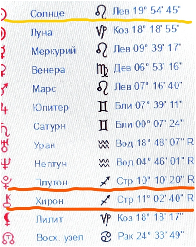 Таблица 3. Сверху, расположение транзитов планет на момент гибели подводной лодки «Курск», 12.08.2000, подчеркнуты позиции Плутона и Хирона, которые образовали с натальным Сатурном Путина В.В. аспект септиль. Сверху подчеркнута позиция Солнца, которое явилось спусковым механизмом, активизировав ось Лунных узлов Путина В.В., а равно , рестимулировав ось Лунных узлов в теле Путина В.В., которые были у Екатерины II. В активное движение пришли энергии всей его натальной карты. Снизу, карта гибели детей- спортсменов г. Нефтеюганска 04.12.2016 года на 16 час. 30 мин. Подчеркнут транзитный Юпитер, соединившийся с натальным Сатурном Путина В.В., который рестимулировал септиль Хирон- Лилит при казни Власова А.А. Диссонанс энергий пошел в связи с соединением транзитного Солнца с Лилит при казни Власова и , вследствие чего, активизировалась энергия неподвижной звезды Антарес на оси катастроф.