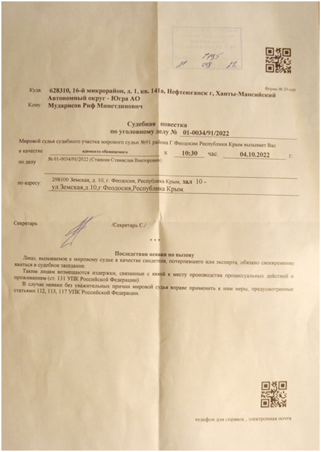 Местом регистрации обвиняемого являлся микрорайон 10, дом 30 в г. Нефтеюганске. Кроме того, судья спросил у следователя: «По документам вы майор, а сидите с капитанскими погонами, вас что, разжаловали?». Здесь уже Вселенная работала на мое эссе касательно службы в рядах Советской Армии. В эссе я отмечал о том, что меня разжаловали со звания младшего сержанта до звания рядовой, и далее указывал на знаковую символику «Спать с лошадьми», то есть, Вселенная закрепляла знание о том, что Путин В.В. является реинкарнированной императрицей Екатериной II.