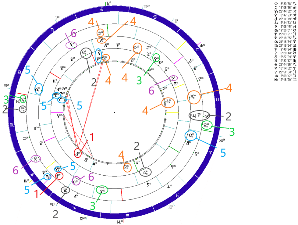 Энергетически по планетарным констелляциям, событие от 30.12.2023 выглядит следующим образом. Транзитное Солнце находится в 9-ом градусе Козерога (отмечено сиреневым 6 на карте 3), в соединении с Лунным узлом трагедии Хиросимы и Нагасаки в 1945 году, Транзитная Лилит в 10- ом градусе Девы (отмечено 6), резонируя с транзитным Солнцем , в то же время, в соединении с Солнцем во вторичной прогрессии Д Трампа, а также образует тау- квадрат с Сатурном Чернобыля (6) и Сатурном (6) карты сдачи в плен Власова А.А , соответственно в 9-х градусах Стрельца и Близнецов. Во время возникновения коронавируса в ноябре- декабре 2019 были использованы 9-й градус Козерога и Рака, где находились тогда транзитные Лунные узлы. Транзитный Меркурий в соединении с Ураном Чернобыльской катастрофы 1986 года в 23-ем градусе Стрельца, в аспекте трин к натальному Плутону Путина В.В, в аспекте секстиль к серединному положению натального Нептуна и натального Меркурия Путина В.В. (отмечено голубым, цифрой 5), в аспектах трин- секстиль к транзитным Лунным узлам (22-ые градусы Весов и Овна) и в оппозиции к натальному Солнцу Д. Трампа в 23- ем градусе Близнецов. Натальная карта Д. Трампа на данном рисунке отсутствует. Транзитный Марс в 27-ом градусе Стрельца, в соединении с натальным Марсом Путина В.В. в 27-ом градусе Стрельца (отмечено 1 в первой и третьей картах), активизировал в информационном сосуде Путина В.В. развратную ось Чикатило: в 27- ых градусах Стрельца- Близнецов. Транзитная Луна (19° Льва) добавила порцию негативной энергии разврата, активизировав ось Лунных узлов в натальной карте Путина В.В. (отмечено оранжевым цифрой 4), а равно в натальной карте Екатерины II (20°Льва – Водолея). Натальная карта Екатерины II в рисунке отсутствует. Цифрой 3 зелёным цветом отмечен резонанс по 30-ым градусам транзита Плутона к Лунным узлам Чернобыльской трагедии, а равно с Меркурием карты добровольной сдачи в плен Власовым А.А. Цифрой 2, чёрным отмечен, пожалуй самый мощный резонанс по 6-м градусам, который , в том числе, аспектирует Плутон и Солнце Чернобыля, Лунные узлы Власова А.А. в момент сдачи в плен 12 июля 1942 года, а равно аспектирует положение Солнца и Луны в момент предродового полнолуния Власова А.А. в 6-х градусах Девы и Рыб. Карта предродового полнолуния Власова А.А. на рисунке отсутствует, Резонанс по двадцатым градусам запустили транзитный Уран и транзитная Луна. , активизировав тау- квадрат, имеющийся в натальной карте Путина. резонанс получил активность во взаимной связи с соединением транзитного Марса с натальным Марсом Путина В.В. Тау- квадрат: двадцатые градусы Льва- Водолея на 20-ый градус Тельца Путина В.В. ранее запускался при гибели подводной лодки «Курск», в то время его запустило транзитное Солнце в 20 градусе Льва, а дополнительным фактором явилось положение опять же транзитного Урана, но в 19 градусе Водолея , существенную роль тогда сыграли транзитные Плутон и Хирон, находившиеся в 11 и 12 градусах Стрельца в соединении с неподвижной звездой Антарес. В настоящей ситуации, заменителем аспекта со звездой Антарес является в карте № 4 положение Чернобыльского Сатурна в 9-ом градусе Стрельца. Здесь надо учитывать энергию прошлого в линейном времени. А именно: при вступлении в должность Президента РФ в 2000 году асцендент Путина В.В. в первичной прогрессии (против часовой стрелки) с 8-го градуса Скорпион