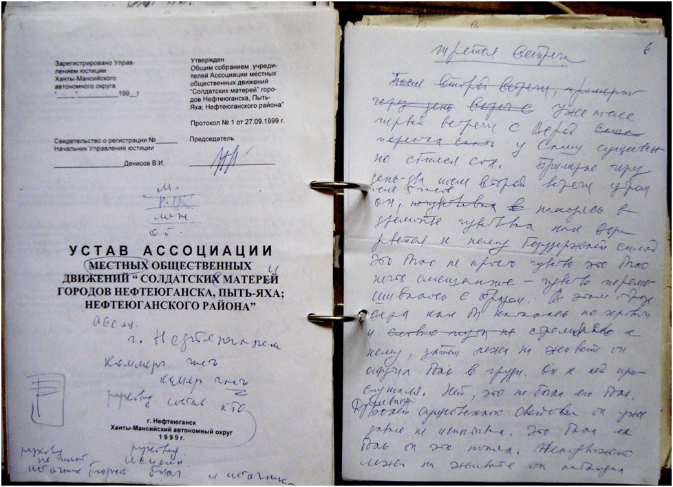 Александр решил пойти несколько вглубь, обратив внимание на то , что расположено рядом с данным документом под названием «Третья встреча», и что- на обороте документа, поскольку он, как правило, использовал для записей черновики. Для предыдущей записи того периода Александр использовал в качестве черновика Устав ассоциации местных общественных движений «Солдатских матерей городов Нефтеюганска, Пыть-Яха; Нефтеюганского района», протокол ассоциации был утверждён 27.09.1999 . В тот период времени он разработал этот устав , поскольку к нему обратились за помощью в оказании подобной юридической услуги. Здесь интересны с позиции анализа сегодняшнего дня несколько факторов. Первый: В 1999 г., разрабатывая устав, Александр не вникал в причины войны в Чечне и рассуждал примерно так. Что это матери кипишуют, сынков из армии стремятся вытащить. Пришло время защищать Отечество, пусть идут и защищают. Сейчас же он смотрел на ту ситуацию совершенно по-другому. Второй фактор- это наглядное проявление нелинейности времени, которое указывало на динамику его развития и которое заключалось в следующем: протокол общего собрания согласно уставу , утверждён 27.09.1999 . Через три года Александр впадает в состояние невменяемости в связи с соединением с энергиями прошлого: взрывов в Москве, Волгодонске, с покушением на взрыв в Рязани, с бомбардировкой Грозного. Это было 30.09.2002. Далее, 30.09.2006 умирает его мать. Через три года, 29.09.2009, он падает в обморок, соединившись с энергией Путина В.В., по оси 27- ых градусов Стрельца- Близнецов (она же- ось сексуального маньяка убийцы Чикатило А.Р.). При этом, следует иметь ввиду, что Путин В.В. пришел в 1999 к власти, организовав эту самую Чеченскую войну , движимый своими личными низменными потребностями. И, наконец, 28.09.2023 согласно решению Совета Адвокатской палаты ХМАО на основании информации судьи он утрачивает статус адвоката. Пройдя колоссальный путь развития, проведя исследования, установив причины своей невменяемости, он указал по делу «Г» на факт невменяемости последнего вследствие подключения к энергии Главы государства, который являлся в прошлом изменником Родины Власовым А. А. и Екатериной II. Власть в России этих знаний страшится , следовательно, в том составе, в котором существует государственная власть , у России нет будущего.