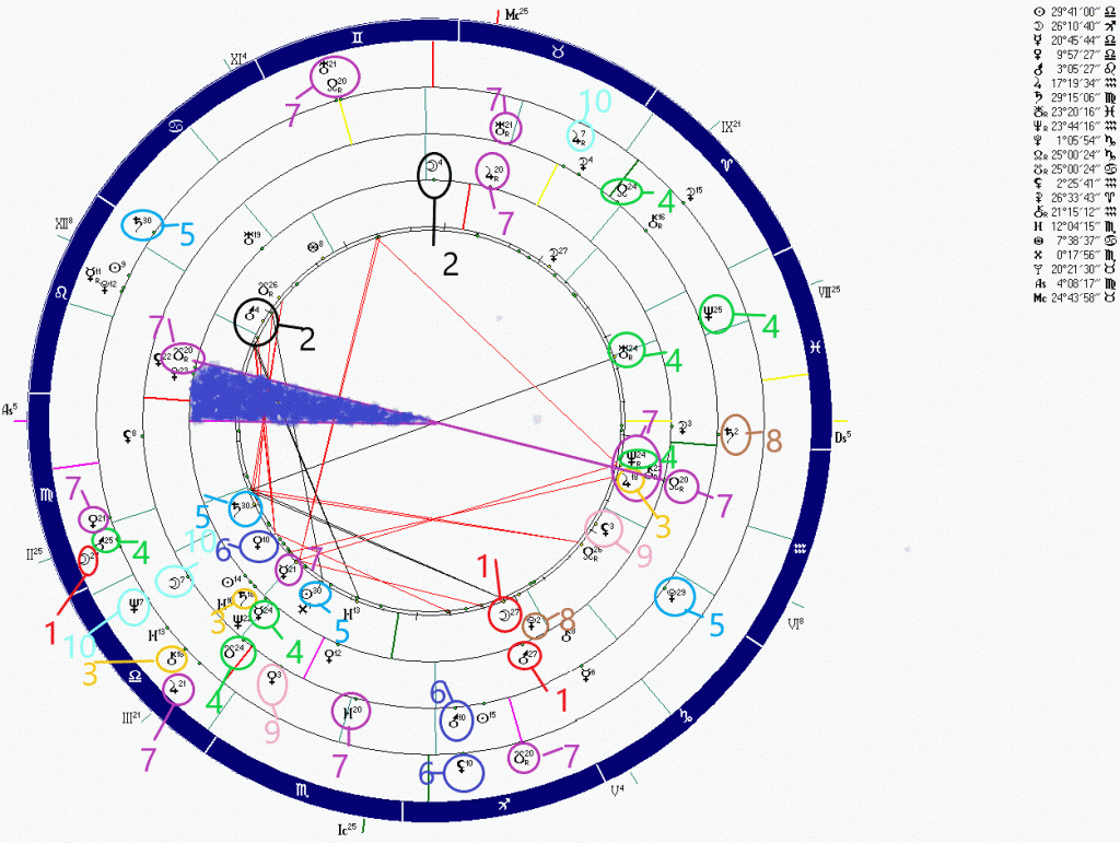 Цифрами 1 обозначен резонанс соединения натальной Луны Алины с натальным Марсом Путина В. в 27-ом градусе Стрельца, то есть соединение на оси маньяка- убийцы Чикатило (это ядро ситуации).