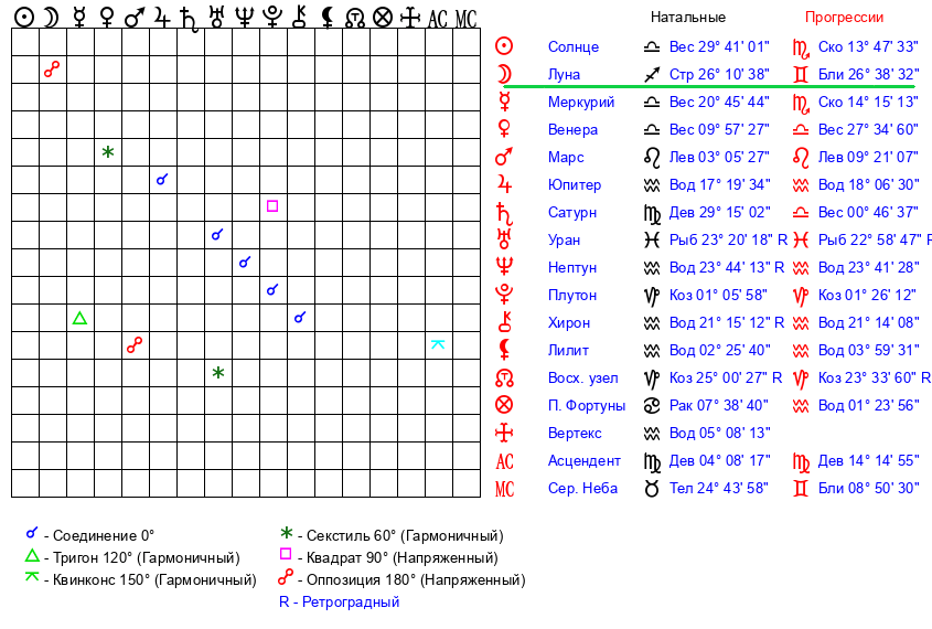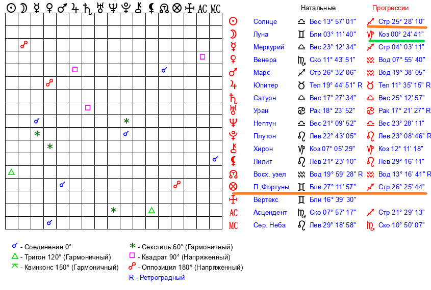 На прогрессиях планет просматривается следующее: Солнце Путина В. во вторичной прогрессии в соединении с натальной Луной Алины, то есть 25° 28 ’10 «Стрельца против 26 °10′ 38″ Стрельца (см. рис. 3). Парс фортуны с учётом прогрессий образует ось 28-го градуса Близнецов, 27-го градуса Стрельца. Луна во вторичной прогрессии в соединении с натальным Плутоном Алины , то есть, 00° 24′ 41″ Козерога к 01° 05′ 58» Козерога (рис.3, цветом отдельно не выделено).