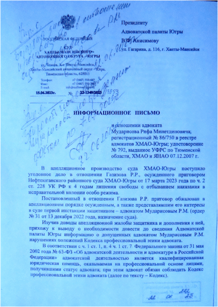 Уважаемые члены квалификационной комиссии, 02.07. 2023 перед отъездом в командировку , в Омск, я обнаружил на электронной почте письмо из Адвокатской палаты ХМАО о необходимости дать пояснения до 07.07.2023 по информации, поступившей из суда ХМАО- Югры в отношении апелляционной жалобы по делу Газизова Р.Р. В информационном письме отсутствовал второй лист с подписью судьи. Командировка планировалась с 02.07.2023 до 12.07.2023 включительно, а в командировках я не пользуюсь сенсорным телефоном, и, как правило, телефоном вообще, имея негативный опыт несанкционированных оперативно- розыскных мероприятий, проводимых в отношении меня наркоконтролем в 2015 году. Однако, необходимо было давать ответ на неполную информацию, методом предположений и догадок на предмет- о каких конкретно нарушениях говорится в информационном письме суда ХМАО- Югры. Ответ я отправил 02.07.2023. Впоследствии мне поступило письмо, в котором содержался полный текст информационного письма из суда ХМАО- Югры. В связи с чем, даю более развернутые пояснения.