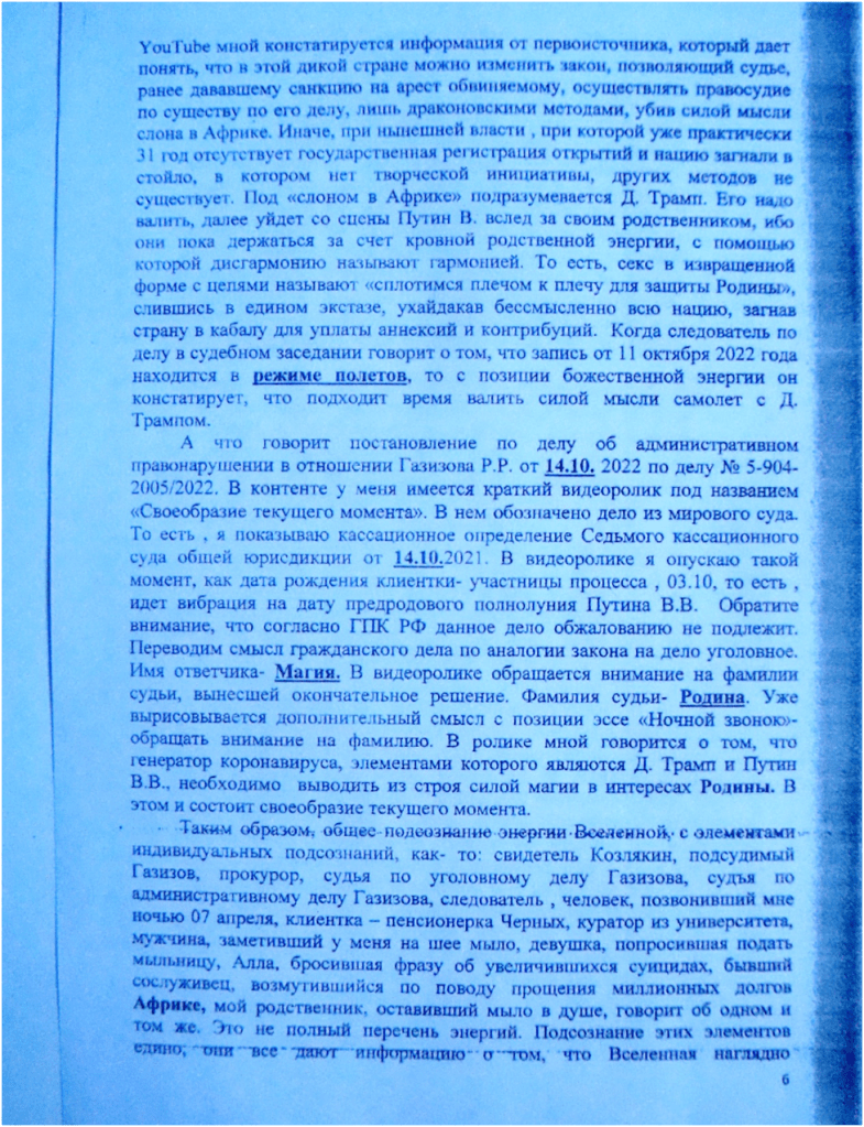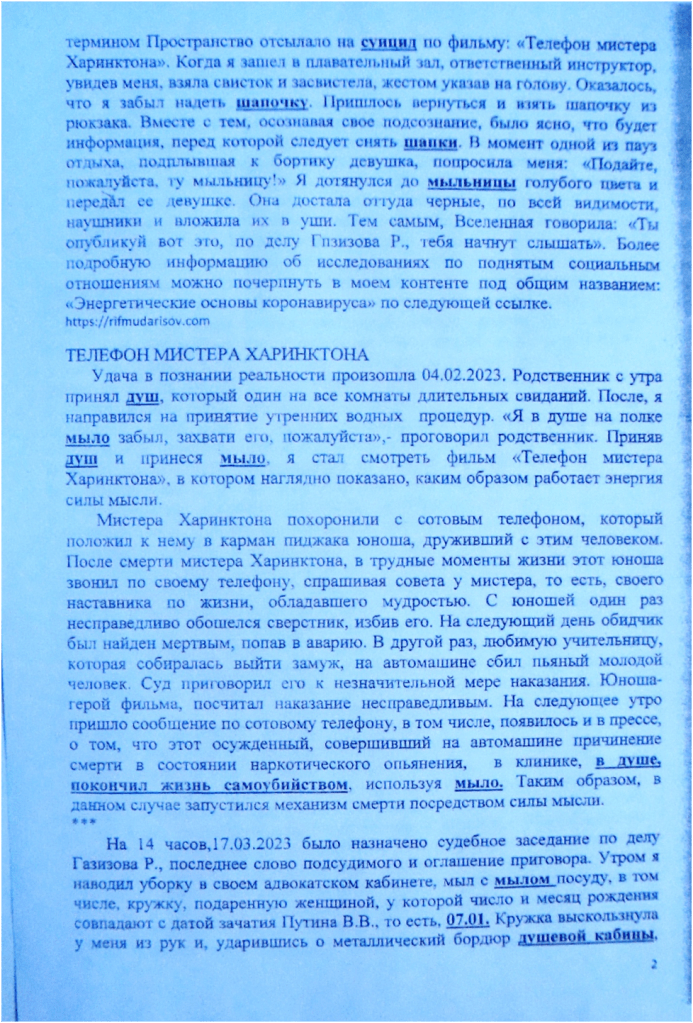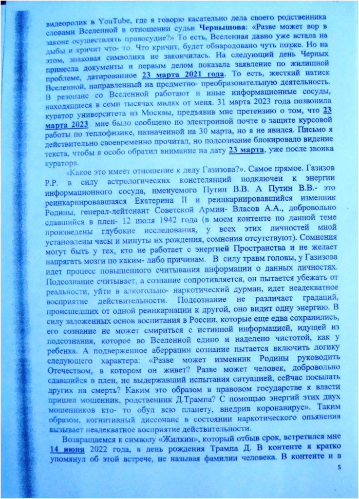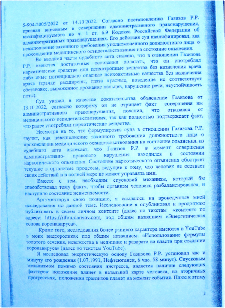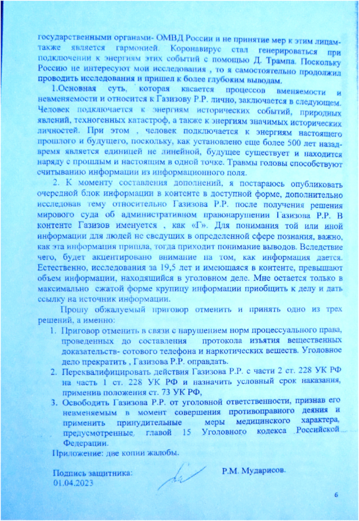 При решении поставленных целей и задач идёт работа с Пространством, которое информирует- решаема ли такая- то задача в данном государстве, а если решаема, то при каких условиях? В файле № 6 флэшкарты под названием «В полшага от момента истины» говорится о том, что для того , чтобы изменить № 58-ФЗ п. 20 ч.1 от 29.05.2002, необходимо силой мысли убить из России слона , который в Африке». В дальнейшем , ведя свой контент под общим названием: «ЭНЕРГЕТИЧЕСКАЯ ОСНОВА КОРОНАВИРУСА- ОСОЗНАНИЕ РЕАЛЬНОСТИ ЧЕРЕЗ ДЕЙСТВИЕ И АНАЛИЗ СИМВОЛОВ», по мере исследования я прямым текстом говорю, что убить слона в Африке из России силой мысли, это значит уронить самолет с Д.Трампом. Чтобы мне с поставленной задачей справится, на примере катастроф двух самолетов в контенте производится звёздный анализ их причин, А для решения задачи пришлось подключиться к энергии самого мощного выброса вулкана Кракатау, имевшего место 27.08.1883 года в 9 часов 58 минут. Но необходимо прежде предъявиться, сообщить об этом, что он вот- вот упадет, что адвокатом и делается. Следует также отметить особенности работы с Пространством, они аналогичны тем приёмам и способам , которыми пользовался Христос. То есть, во Вселенной существует иерархия целей. Низшее подчиняется высшему и высшим же используется. Применительно к делу Газизова Р.Р. это выглядит следующим образом. Дело создано Вселенной и является элементом плана той же Вселенной , направленного на отмену , как № 58-ФЗ п. 20 ч.1 от 29.05.2002, так и на реализацию открытия , касательно энергетической основы коронавируса, и ряда других открытий, так и преследует цель- не допустить до власти в 2024 г. Путина В.В. Вот таким образом, глобально работает Вселенная, то есть, центром, в данном случае, является адвокат, а всё остальное: целеполагания других участников процесса являются периферией. А низшее- это вменить обвиняемому ч.2 ст.228 УК РФ, вместо, скажем, ч.1 ст. 228 УК РФ, как вариант. В судебном заседании исследуется переписка по сотовому телефону, знаки Вселенной говорят, что начался режим полетов. Самолет падает , но не с Трампом , а с Пригожиным Е. , который является родственником Трампа Д. , а равно и Путина В.В. Кратко свой вклад в падение самолёта с террористами, а финансовой основой международного терроризма является незаконный оборот наркотиков, изложено в моем контенте и частично в приложении к данной жалобе.