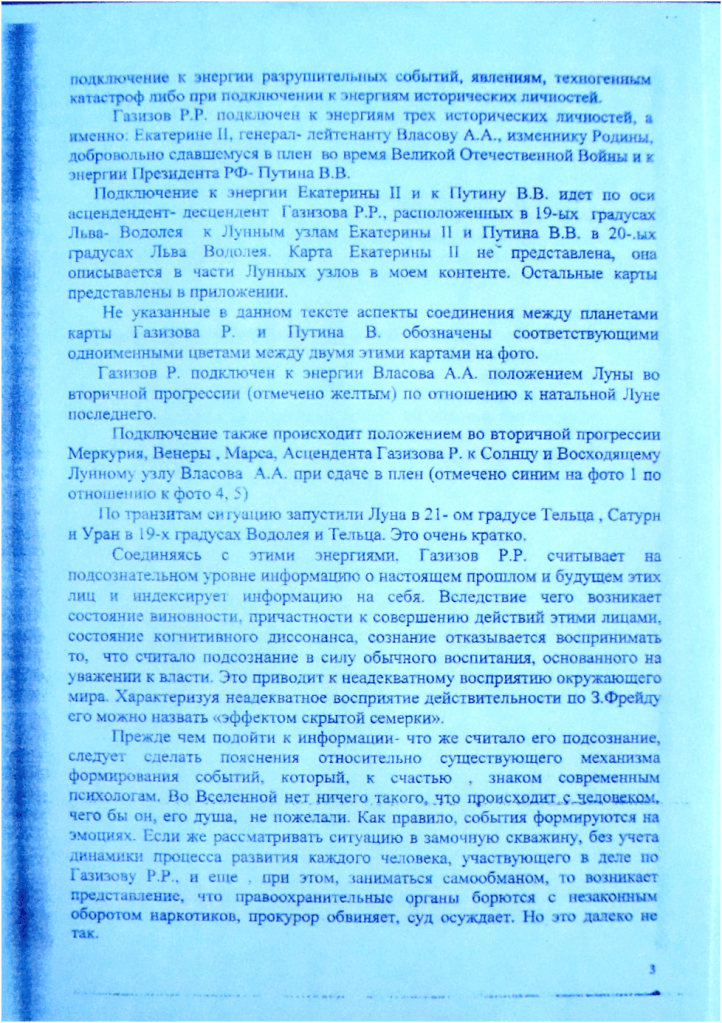 Ниже приводятся не в полном объёме материалы дисциплинарного производства по информации судьи, приведшие к утрате статуса адвоката. В контенте по делу «Г», он же Газизов, в одном из блоков, имеются в цветном виде аспекты планет на его карте, карте Власова А.А. и Путина В.В. Жалоба в Федеральную палату адвокатов РФ осталась не рассмотренной без объяснения причин.