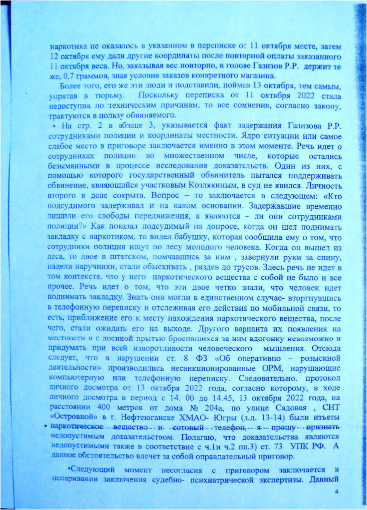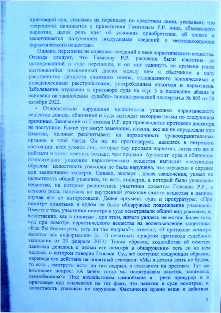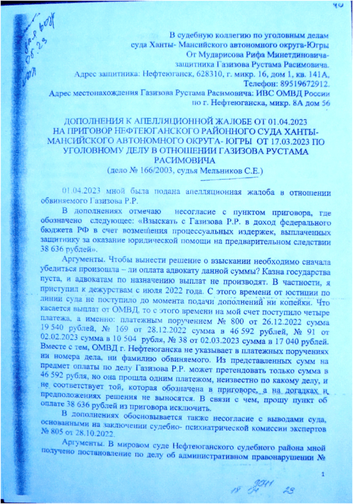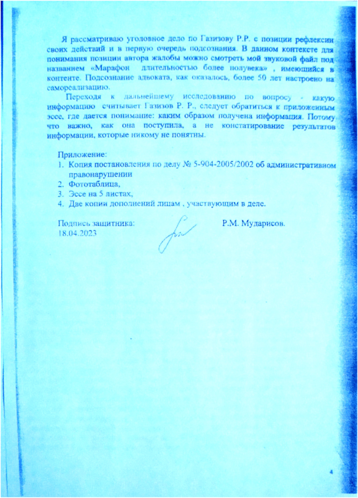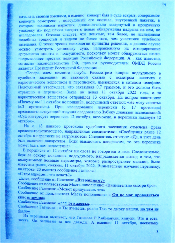 А если знания экспертов отстают от знаний адвоката лет на 1 500- 2 000, что в таком случае делать? В этом случае, действуя честно, не скрывая ни от кого свои знания, согласно нормативным документам об адвокатской деятельности и адвокатуре в РФ адвокату остается аргументировать своё мнение, в надежде , что судья услышит данное мнение. Других способов защиты, иначе, как выразить мнение с аргументами, у адвоката не существует, что я и сделал. Адвокат Кисельман, обосновывая свою позицию, вероятно, совпадающую с позицией Совета, сказал следующее: «Поскольку вы не заявляли ходатайства о назначении повторной экспертизы в суде первой инстанции, не говорили о звездах в первой инстанции, а высказали это в апелляционной жалобе, то, следовательно, ваши действия непрофессиональны». Вместе с тем, внимательно изучая текст апелляционной жалобы, можно обнаружить мою позицию на этот счёт. На оборотной стороне листа судебного дела 14 и лицевой стороне листа 15 отражена моя позиция по данному аргументу коллеги. То есть, я узнал о факте нахождения Газизова Р.Р. в состоянии наркотического опьянения, в момент противоправного деяния, получив соответствующее решение по делу о привлечении к административной ответственности, лишь 30 марта 2023 года , следовательно, по объективным причинам мне было ранее невозможно излагать в суде первой инстанции позицию касательно его вменяемости и невменяемости. Отсюда вытекает, что я законодательно, чисто с профессиональной точки зрения, вправе приложить дополнения, в которых говорится о новых сведениях. В этой части решения, которое основывалось на позиции, изложенной адвокатом Кисельман, действия Совета неправомерны.