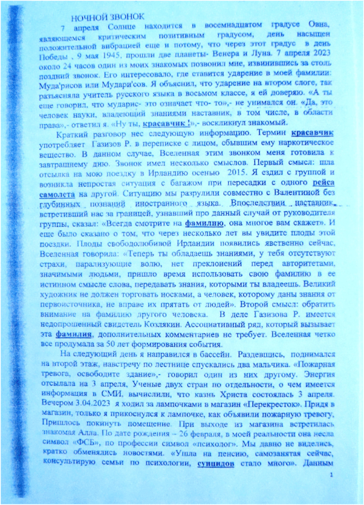 Я решил направить в университет заявление по предложенному образцу об условном переводе меня на 4 курс с обязательством о сдаче задолженностей по дисциплинам до определенного срока. Срок на подачу заявления был установлен не позднее 31 августа 2023. Я заполнил заявление, как вдруг раздался и тут же затих звонок на сотовый телефон. Я набрал звонившего. Мужчина извинился , сказав, что хотел зафиксировать мой номер на телефоне, но получился звонок. «Вчера моя жена звонила вам и договаривалась о встрече, на утро. Можно – ли встречу перенести на послеобеденное время?», — спросил мужчина. Я согласился на 14 часов. Он хотел оспорить решение суда о лишении его водительских прав вследствие обгона, поскольку имел запись на видеорегистраторе. Таким образом, шла отсылка на символ «скачки напряжения» , посредством символики , ранее данной через дело Валерия, где он оспаривал решение ОГИБДД посредством записи на видеорегистраторе. По символике я стал понимать, что знаковая информация таила в себе несколько смыслов. Первое, клиент позвонил, когда я заполнил документ, который должен был отправить до 31 августа в университет. Это отсылка на вибрацию о дате смерти М.С. Горбачева и дату рождения Власова А.А.