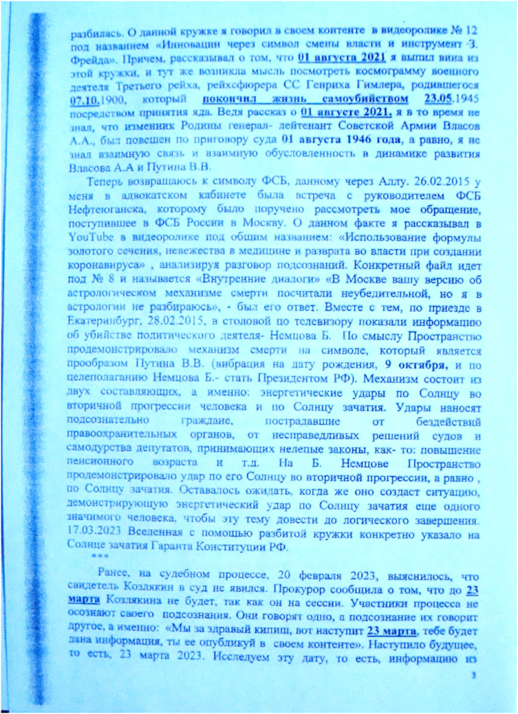 Теперь исследуем кратко документ под названием «Третья встреча» с позиции того, каково его содержание в астрологическом плане. As в соединении с натальным Солнцем Путина В.В. в 14-ом градусе Весов. Mc- высшая цель, 20° 39′ 41″ Рака , в соединении с натальным Ураном Александра и транзитной Луной при заболевании 30.09.2002 . Плутон, 26° 25′ 33″ Стрельца в соединении с натальным Марсом Путина В.В. и развратной осью Чикатило, а равно в соединении с Луной во вторичной прогрессии у Александра при обмороке 29.09.2009 . Точка любви и брака в соединении с транзитным Солнцем в момент падения самолета Пригожин, т.е., 0°56′ 01″ Девы против 0°15′ 12″ Девы и против Северного узла натальной карты Пригожина (0°33′ 57″ Девы). На оборотной стороне первого листа записи «Третья встреча» стоит почтовый штемпель 13.07.1997 г. письма из Арбитражного суда ХМАО- Югры. То есть, вибрация на дату добровольной сдачи в плен Власова А.А.(12.07.1942). Поскольку текст оборотного листа содержит информацию о банкротстве предприятия ООО «Югандрев» , то есть, включается символ «ликвидация», следовательно, однозначно Пространство говорит: «Следующий шаг- ликвидация Путина В.В. силой мысли, загнав его в сумасшедший дом, подключив его к энергии Власова А.А., то есть, рестимулировав психотравму от 01.08.1946 года». После чего разъяснить возникшую аспектацию в своем сайте, чтобы у здравой части людей, принимающих решения, имеющих право законодательной инициативы, не было сомнений о том, что Путин В.В. является реинкарнировавшимся Власовым А.А. и звёзды являются основой в психологии и в психиатрии. Это в узком смысле, а в широком – не допустить его до выборов. Это оно говорит сейчас, и это было заложено в гороскопе третьей встречи с Верой, 04.05.2006 года.