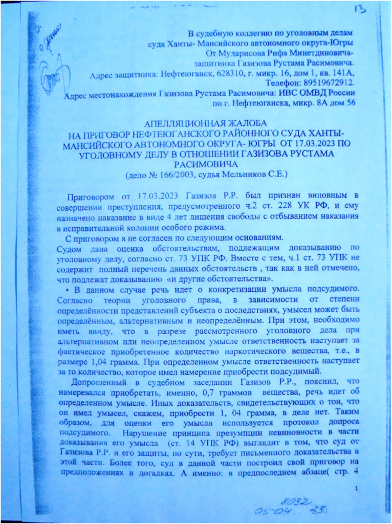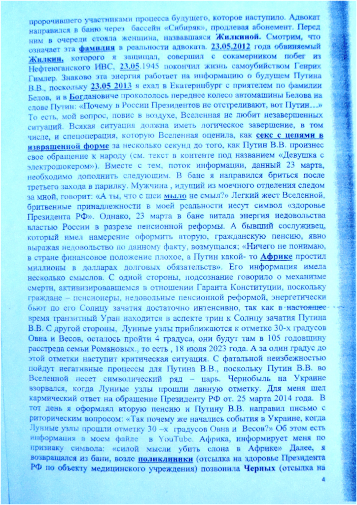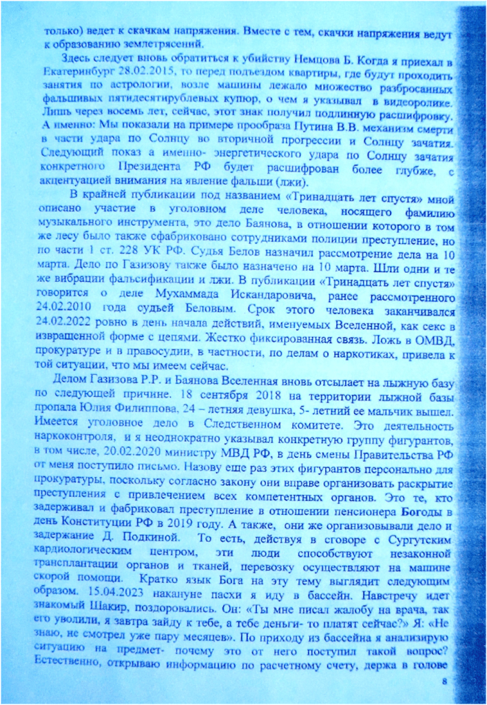 У меня есть некоторые несогласия с позицией судьи Чистовой Н.В. в отношении астрологических, политических и т. д. аргументов по нескольким причинам. В статье 2 закона РФ «О государственной тайне» говорится, что материальные объекты, в том числе, физические поля, в которых сведения, составляющие государственную тайну, находят свое отображение в виде символов, образов, сигналов, технических решений и процессов могут являться объектами государственной тайны. То есть, речь идет о невидимых глазом объектах и производимых ими явлениях. Следовательно, излагая вопрос вменяемости и невменяемости можно говорить о тех явлениях, которые глазом не видны, но в геометрических схемах просматриваются и рассчитываются до градусов, минут и секунд. Более того, мне известны случаи о том, когда в 80-х годах суд выносил решения о вменяемости или невменяемости подсудимого вопреки мнению экспертов, имеющих самую высокую репутацию, основываясь на личном убеждении. В настоящее же время суд самоустранился от такого анализа , умаляя сам свои возможности, заняв позицию следующего характера: мы не специалисты, и у суда нет оснований сомневаться в заключении экспертов. Отчетливо понимая, что эксперты стоят на уровне каменного века и далеки от объективного исследования реальной картины происходящего, мне ничего не остается, как прибегнуть к знаниям, которыми я обладаю, обосновывая позицию невменяемости клиента. Однако, эта позиция наталкивается на несколько составляющих, в том числе, политический вопрос, то есть, кто у власти, его ценностные ориентации, и как взаимодействует поле обвиняемого при соприкосновении с полем гаранта Конституции РФ. Время, когда суды в мире начнут использовать перечисленные знания, уже на подходе. Вынося несправедливое решение, суд , всякий раз, запускает механизм смерти в отношении Гаранта Конституции РФ. А именно. Происходит убийство, не только направленное на разрушение отдельных внутренних органов человека, каковыми являются сердце и другие, происходит нарушение функциональных возможностей организма, идет энергетический выброс со стороны осужденного и адвоката, провоцирующий самоубийство человека , а равно, в процессе массированной атаки происходит разрушение психического здоровья Президента РФ, что привело к неадекватным действиям- в 2014 году на Украине и продолжается в спецоперации на Украине сейчас. Слишком велика доля ответственности за нынешнюю ситуацию национального суда РФ и прокуратуры. В частности, покрывая сотрудника ОМВД Козлякина, сфабриковавшего преступление с наркотиком, суд и прокурор потворствуют явлению, называемому международный терроризм, поскольку финансовой основой международного терроризма, как указывалось в преамбуле одного из Пленумов Верховного суда РФ являются преступления в сфере незаконного оборота наркотиков. Поскольку правоохранительные органы не принимают мер к конкретной группе преступников из числа наркоконтроля, причастной к убийству Юлии Филипповой, на эту группу я указывал ещё в 2020году ФСБ города Сургута и Министру МВД РФ, я считаю возможным упомянуть это в апелляционной жалобе, поскольку прокурор обязан на это отреагировать, имея на то все необходимые полномочия. Более того, есть повод. События сформированы таким образом, что два сфабрикованных преступления в отношен