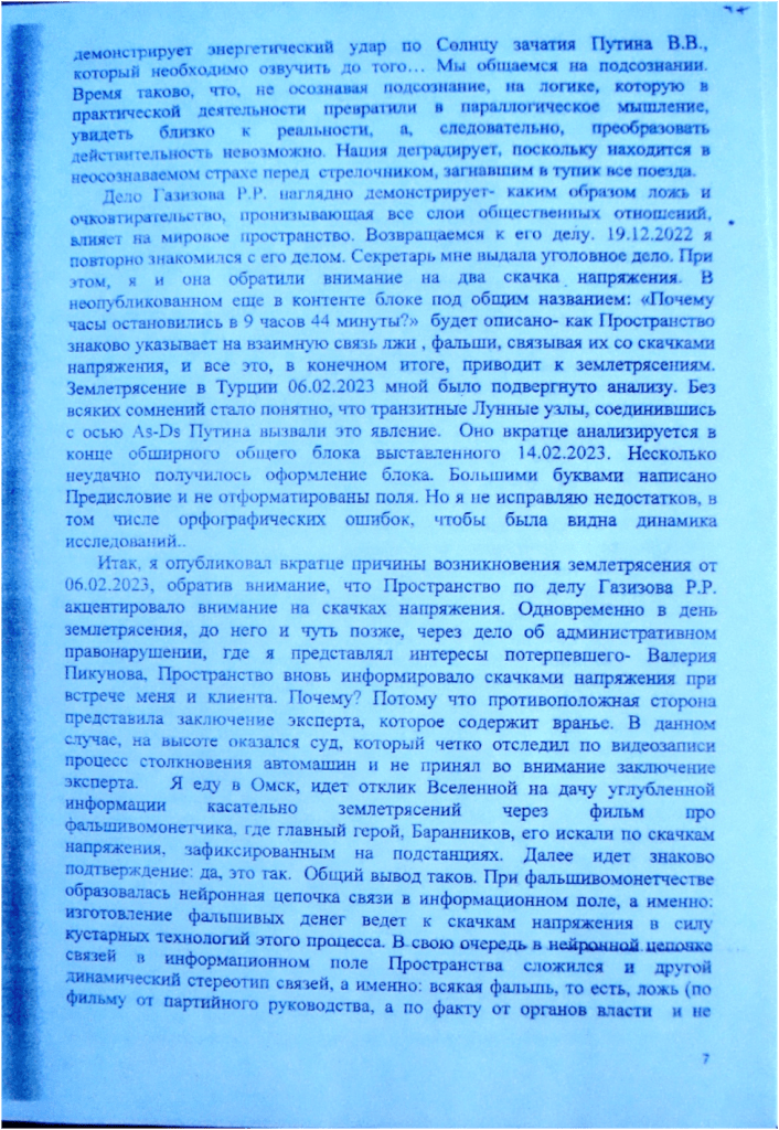 Красной нитью в жалобе и в дополнениях проходит тема самообмана. Более того, сказано, что всякое вранье вызывает скачки напряжения , что ведет к цунами, землетрясениям на примере конкретного землетрясения в Турции от 06.02.2023. И еще вновь прослеживается тема национальной программы убийства царя. Поскольку в России согласно Конституции РФ Президент страны является гарантом Конституции, то, следовательно, всякое несправедливое судебное решение запускает механизм смерти в отношении него. Более прямым текстом это можно выразить так. Судья, выносящий несправедливое решение, на подсознательном уровне желает смерти Гаранту Конституции РФ, но он этого не осознает, так , что принимайте решения осознанно. Если суд будет принимать решения осознанно, то мышление будет иным: «А зачем это мне нужно, выгораживать лжесвидетеля из полиции, ну и что, что у него прямой руководитель- Президент РФ».
