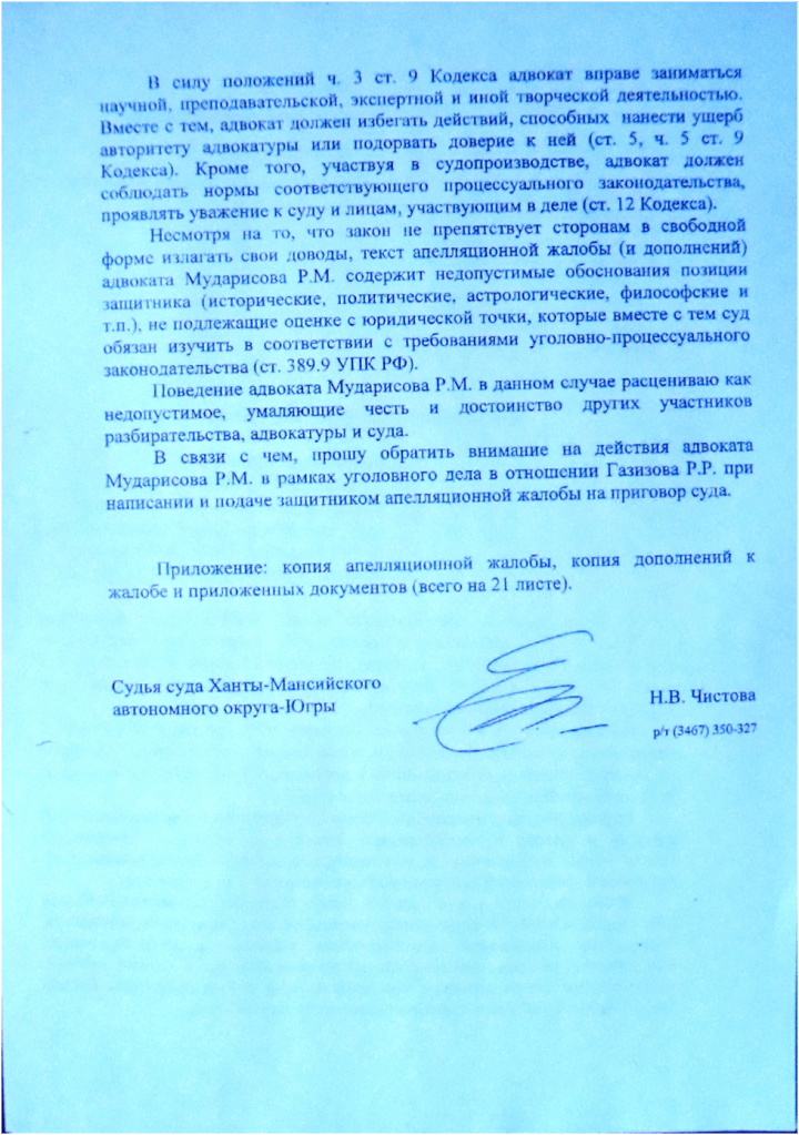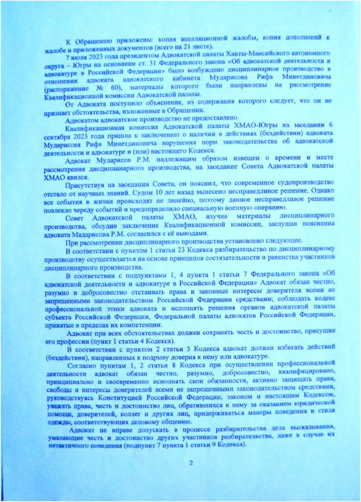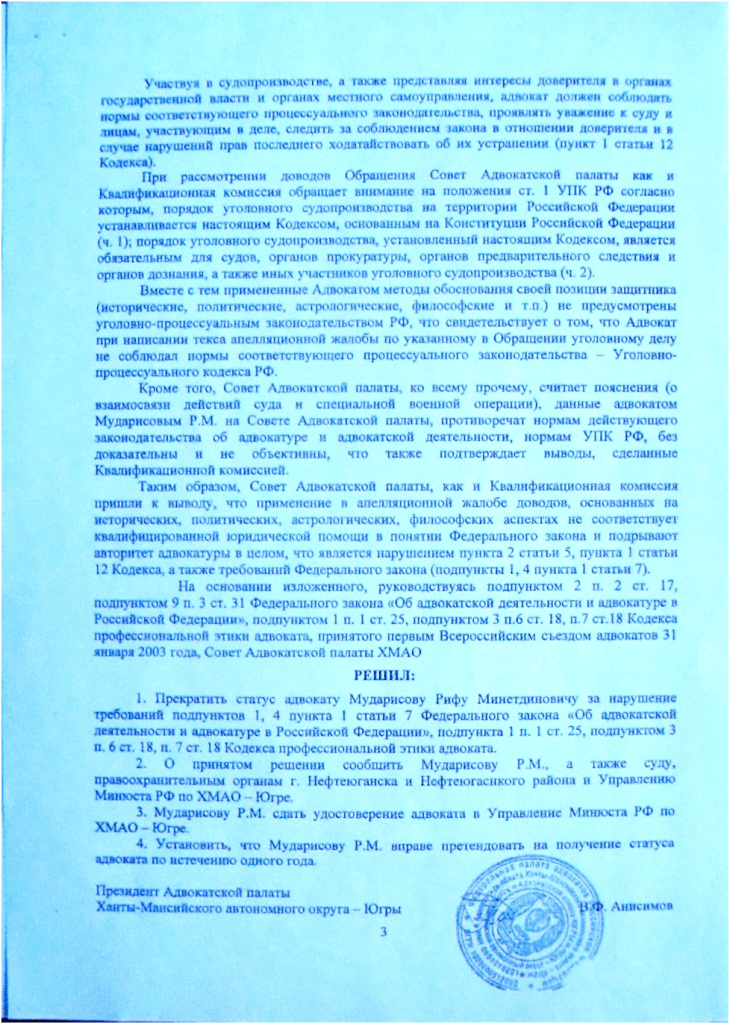 28.09. 2023 Советом Адвокатской палаты ХМАО- Югры на основании дисциплинарного производства по обращению судьи Чистовой Н.В. в отношении адвоката адвокатского кабинета Мударисова Р.М. вынесено решение о прекращении статуса адвоката за нарушение требований подпунктов 1,4 пункта 1 статьи 7 Федерального закона «Об адвокатской деятельности и адвокатуре Российской Федерации», подпункта 1 п.1 ст.25, подпунктом 3 п.6 ст. 18. п.7 ст. 18 Кодекса профессиональной этики адвоката.