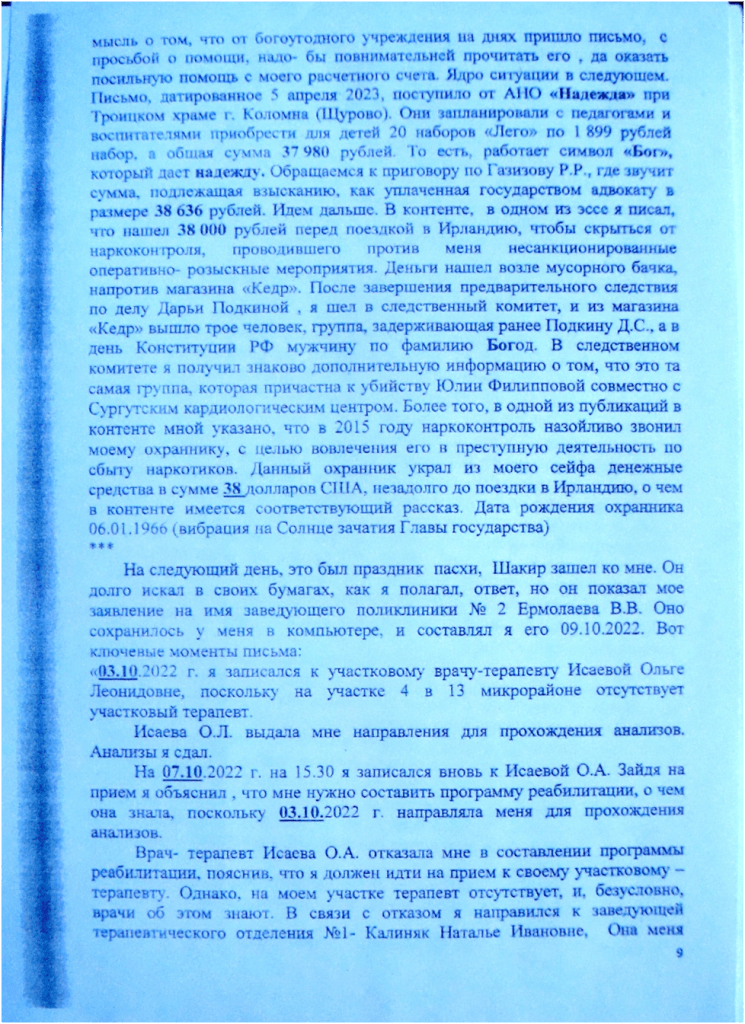 Я от имени истца подал суду для приобщения к делу документ от «Сургутской окружной клинической больницы», расположенной по улице Энергетиков 24/2. На документе сверху указано следующее: 03.08.2023 08:45 Консультация (прием) невролога. На оборотной стороне подпись врача Абдулаевой Ф.Б. Документ нёс несколько смыслов: в нем была отсылка на полную идентификацию даты казни Власова А.А. по признаку два дня до либо два дня после 01.08; следующий смысл- по городу Сургуту шла отсылка на незаконную трансплантацию органов и тканей, совершенную сотрудниками наркоконтроля- убийства в отношении Юлии Филипповой. Данная тема давалась и в бане, но в контенте каждый элемент знакового общения со Вселенной не описывается, необходимо, всякий раз, текст сжимать. Оставалось лишь повнимательней изучить гороскоп на 8 час 45 мин от 03.08.2023 по г. Сургуту. Нет ли в нём дополнительного смысла?