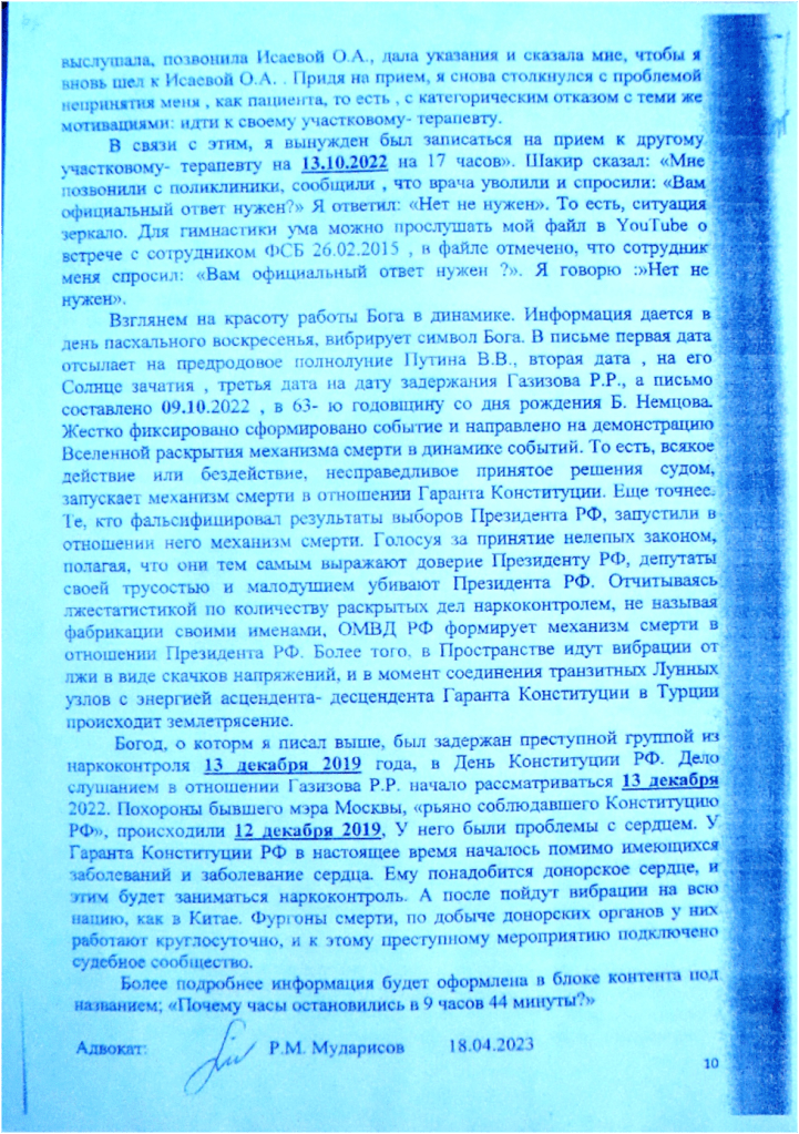 Поясняю, что каждое действие человека формирует реальность. В пространстве вариантов существует множество файлов, ряд из которых мы открываем, а другие остаются неоткрытыми в связи с проведенными действиями того или иного характера. Окружающий мир жестко фиксировано об этом информирует. В пространстве вариантов существуют файлы об отсутствии СВО в период времени, в котором мы живём, а равно и о наличии СВО. На примере дела Мухаммада Искандаровича, рассмотренного судьёй Беловым и вынесшего приговор 24.02.2010 г., которое я упомянул в дополнениях к апелляционной жалобе, происходит следующее: энергия лица, вынесшего несправедливый приговор, направляется на открытие файла, при котором возникнет СВО. И наглядно файл в линейном времени открывается 24.02.2022, когда Мухаммад Искандарович , отбыв срок, выходит на свободу. Множество сотен тысяч , а возможно и несколько миллионом однократных действий судей, вынесших несправедливые приговоры относительно незаконного оборота наркотиков направляются в определенную точку, для открытия файла СВО, которая является не защитой Отечества , а средством уничтожения нации, в том числе, через наркотики. СВО субсидируется не только средствами от отобранных пенсий у граждан и невыплаченными вознаграждениями адвокату, основные средства идут от продажи наркотиков, которые организует полиция, и она же ловит людей и фальсифицирует преступления, а суд и прокуратура делают вид, что все процессуальные действия органами полиции проведены с соблюдением закона, то есть , занимаются самообманом. В данном случае, поскольку правоохранительные органы перешли пределы разумного, то есть , в этом формате идёт тотальная деградация, я , как гражданин, обязан выступить. Выступая , меня не интересует, как я выгляжу перед судом, перед Советом адвокатской палаты, перед прокурором, важно, как я выгляжу перед Богом.