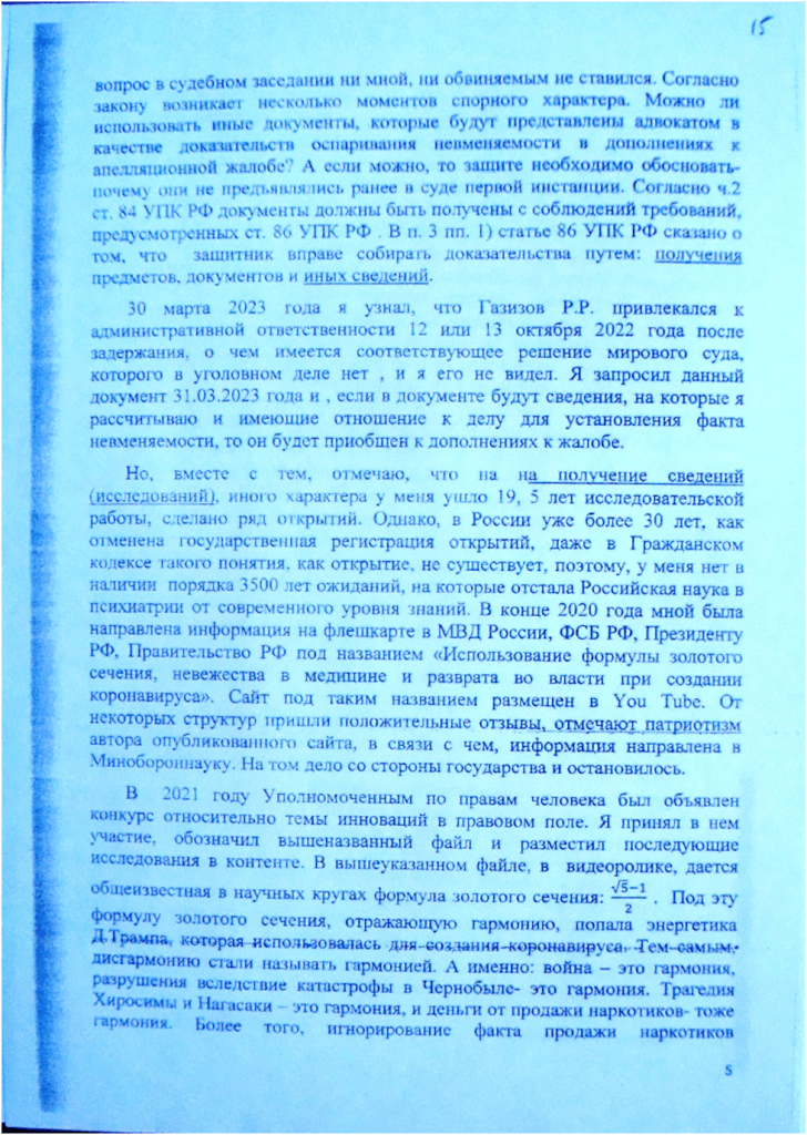 В своей апелляционной жалобе я ссылаюсь на информацию, которую опубликовал в YouTube и в контенте, указав координаты, то есть , как её найти, поскольку понимаю, что, в целом, информация добытая мной , по своему содержанию при её обработке составит ряд докторских диссертаций и несколько научных открытий, в том числе, в медицине, в узком смысле, в психиатрии, более того, содержит информацию о мировом открытии, касательно энергетической основы коронавируса. Но эта информация трудна для восприятия, поэтому я ограничился минимумом, для показа- каким образом она достается, и как работают символы в Пространстве. Вместе с тем, в России, как я писал, отсутствует государственная регистрация открытий более 30 лет, и понятие «открытие» в Гражданском кодексе РФ отсутствует. При подобном положении вещей нет иного способа как выходить за общие узкие рамки представлений об уголовном процессе, поскольку иного способа объяснить – каким образом досталась информация, кроме эссе, я не обнаружил. Голословно утверждать о каких- либо явлениях было – бы неверным, важно – каким образом человек получил информацию, чтобы не специалисту была понятна логика рассуждения.