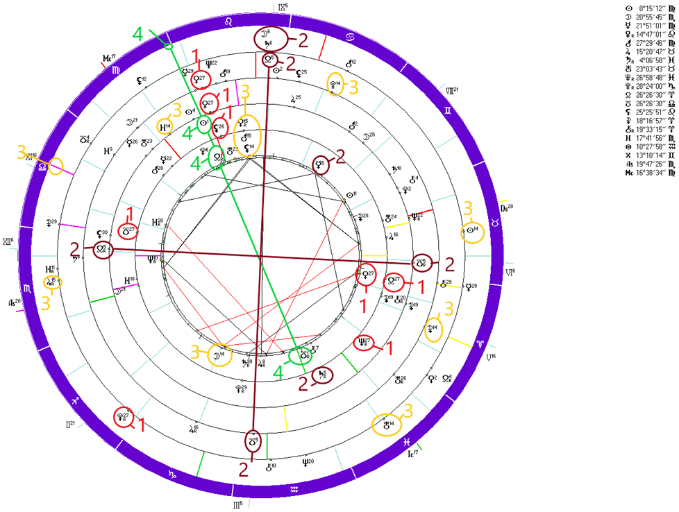Цифрами 4 (зелёным) отмечена резонансная линия, идущая по 1-ым градусам Девы по Лунным Узлам Пригожина Е. В резонансную линию вписывается Солнце события- падение самолёта в 1-ом градусе Девы, Точка любви и брака в гороскопе третьей встречи Веры и Александра в 1-ом градусе Девы. В резонанс входит ось 1-ых градусов Весов и Овна, которая у Александра в натальной карте поражена, что вытекает из других публикаций контента. Его натальная карта здесь не представлена.