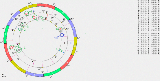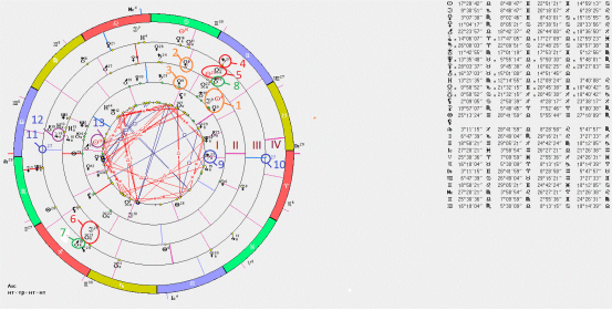 - Положение трёх планет в предродовое новолуние на 30/05/1946: транзитных Солнца, Луны, Меркурия- все в 9-ом градусе Близнецов.