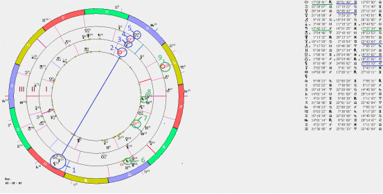 - Положение As в условной первичной дирекции (против часовой стрелки) в возрасте 13 лет при поступлении в в Нью-Йоркскую военную академию (22-ой градус Льва).