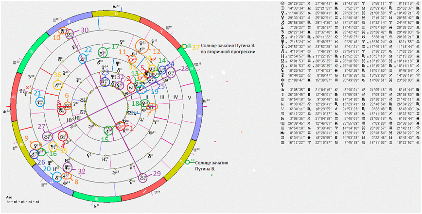 Солнце И.В. Сталина и Марс В. Путина, находясь в 27- ом градусе Стрельца, начинают резонировать с Лунными узлами при присвоении статуса иноагента А.Козыреву (отмечено 4,5 в карте III) и Ураном в карте зачатия И. В. Сталина (3) . Далее отмечаем множество планет в правом верхнем углу схемы, которые и составляют ядро ситуации, поскольку это множество соединяется с Солнцем зачатия во вторичной прогрессии В. Путина ( отмечено за пределами зодиакального круга цифрой 37). Солнце имеет достаточно большой орбис (допуск воздействия). Оно находится в 29- ом градусе Рыб, это ориентир, Солнце может быть и в 26 , 27 и в 28 градусах, всё зависит от нюансов процесса зачатия, день или два ранее вычисленной даты. С Солнцем зачатия во вторичной прогрессии В. Путина соединяются транзиты планет на момент признания А. Козырева иноагентом, а именно: Нептун (1-ый градус Овна),Меркурий (28-ой Рыб),(Восходящий Лунный узел(27-й Рыб), Сатурн(26-й Рыб) , Венера (25-ый Рыб). По отношению к карте А.Козырева эти все энергии соединяются с его Юпитером в 25-ом Рыб), что отмечено синим, числом 24. Но Солнце зачатия во вторичной прогрессии В. Путина соединяется не только с этими энергиями, но и с Солнцем зачатия Сталина (28-ой Рыб), что отмечено 33 жёлтым на карте II и Меркурием зачатия И.Сталина (26-ой Рыб), отмечено 13 зелёным. Далее , эта энергия соединяется с Сатурном при рождении И. Сталина в 27-ом градусе Рыб, отмечено красным 2 , энергия аспектирует оппозицию с Сатурном А. Козырева (29-й Девы), отмечено жёлтым 35. Далее, энергия аспектирует оппозицию Луны в 26- ом Девы (отмечено зелёным 16) и Марса в 25-ом Девы (отмечено синим 26) при казни Власова А.А. по отношению к множеству планет схемы в окрестностях 25-30 градусов Рыб и 1-го градуса Овна (транзитный Нептун на текущий момент).