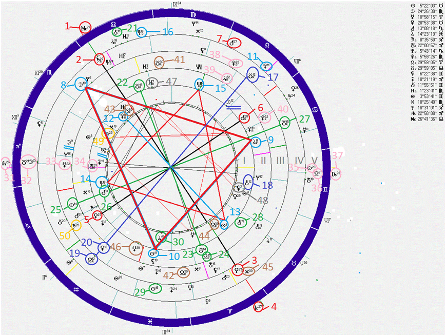 Меркурий Р.М. Горбачёвой, в 22-ом градусе Стрельца(33) и Юпитер в 22-ом градусе Льва(39) попадают в резонансную связь с Ураном(34) и As Чернобыля(31) в 23-ем градусе Стрельца и Плутоном(38) при смерти Сталина в 22-ом градусе Льва. Второе светило- Луна трагедии Чернобыля срезонировала в 25- ом градусе Скорпиона (отмечено жёлтым 49) на Сатурн Р.М. Горбачёвой в 25- ом градусе Козерога (отмечено жёлтым 50), да не только. При начале похорон И.В. Сталина Луна находилась в 25-ом градусе Стрельца. Карта похорон здесь не представлена.